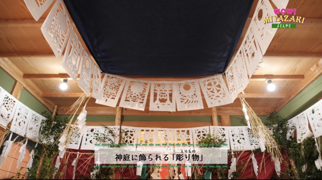 มีการจัดแสดงทั้งสี่ด้านของ Kouniwa ซึ่งเป็นเวทีที่แสดงคางุระยามค่ำคืนใน Takachiho